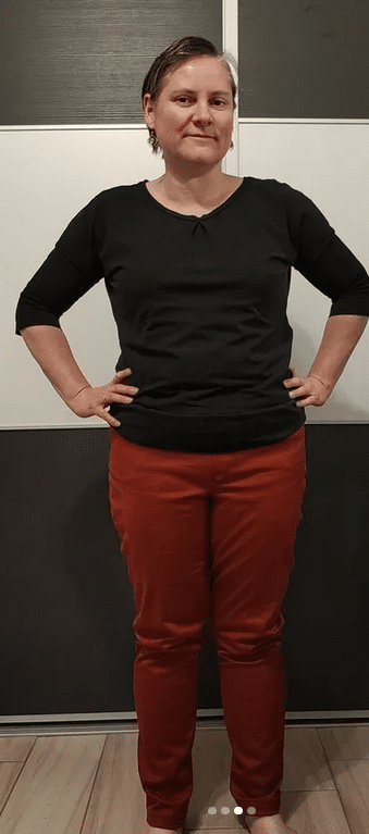 J’ai suivi le tableau des mensurations mais comme j’ai choisi un tissu coton non stretch, elle est un peu juste au niveau de la poitrine. Elle est tout de même confortable, entendons nous bien ! Je compte bien la porter régulièrement 😉