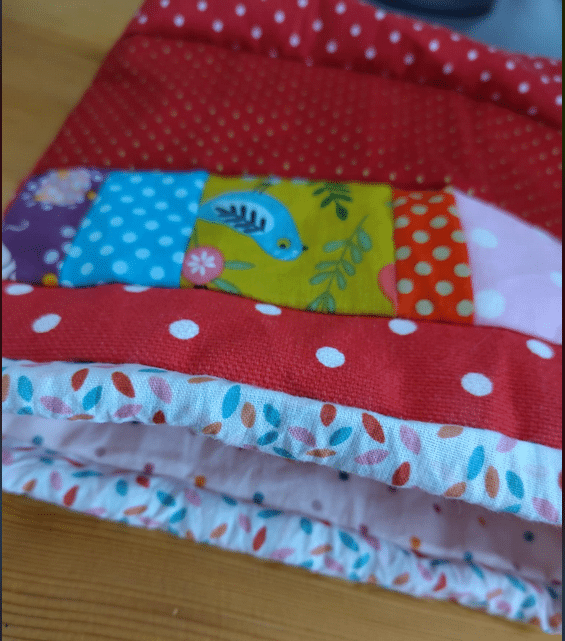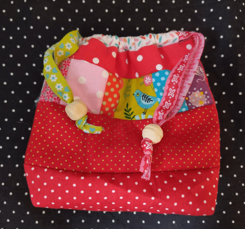 Je commence aujourd’hui en vous présentant un petit sac coloré comme je les aime. Je l’ai réalisé avec uniquement des chutes, des chutes à pois bien évidement ;-).